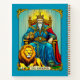 Revista de diseño inspirado en el tarot con "El Emperador" sentado en un trono, coronado y recubierto de azul y rojo. Un león poderoso se sienta a su lado, simbolizando fuerza y autoridad. La carta simboliza estabilidad, liderazgo y disciplina.
