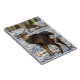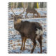 El ciervo rojo salvaje en un paisaje de bosques nevados con el escenario mirando directamente a la cámara.