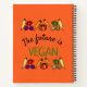 Este cuaderno de recetas tiene el mensaje: El futuro es VEGAN. Las palabras están escritas con letras negras y verdes, y decoradas con verduras brillantes y coloridas dibujadas a mano en un fondo naranja. Puedes personalizarlo con tu nombre y palabras. Están decorados con carátulas delanteras y traseras.