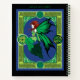 Un hada de cabello rojo, todo de color verde, con nudo celta verde, trabaja por todas partes.