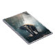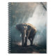Un cuaderno en espiral con una fotografía de un elefante asiático con orejas redondeadas de pie en un bosque despejado mirando hacia el espectador con la luz del sol cayendo por el dosel arbóreo.