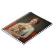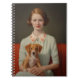 La imagen representa un retrato de estilo vintage de una mujer sonriente con el cabello rojo, con olas suaves, vestido de verde menta pálido con un collar blanco con bordado floral. Se sienta en un sofá rojo y sostiene en su regazo un adorable cachorro marrón y blanco. El tono general del retrato es cálido y nostálgico, con la expresión amable de la mujer y la calma del perro añadiendo su encanto.