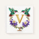 The floral arrangement surrounding the letter V features an abundance of purple blooms in various stages of opening. Fully opened passion flowers reveal complex layered petals in deep amethyst, violet, and lavender shades, each petal edge highlighted with crystalline sparkle. White flowers with detailed golden stamens add bright contrast points and classical elegance. The supporting elements—emerald leaves with intricate veining patterns, small sapphire buds, and a graceful golden tree with delicate branches—create a complete garden ecosystem symbolizing victory, vitality, and the celebration of love's milestones.