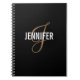 Elegante cuaderno negro con un guión dorado inicial y un nombre blanco. Personaliza con tu nombre y inicial.