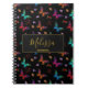 Un cuaderno personalizado diseñado con un patrón elegante con una ilustración gráfica de mariposas revoloteando en muchos colores brillantes, que contrastan muy bien con el fondo negro. Los florales caprichosos, ramitas y hojas añaden un toque de encanto. Un marco negro con un borde dorado superpuesto con tu texto personalizado dentro.