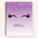 Un cuaderno con un diseño moderno y de diseño. El fondo es un color de gradiente morado con una imagen de purpurina espumoso falso goteando desde la parte superior. Un par de pestañas lindas y niñitas debajo de la imagen del purpurina.