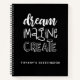 Este cuaderno de dibujo personalizado de 8,5 x 11 tiene texto blanco sobre un fondo negro tradicional. Las palabras, "SUEÑO, IMAGINA, CREAR" en un tipo de letra dibujado a mano personalizado con su nombre debajo. Personalizar el cuaderno de bocetos con el nombre de tu elección para hacer que alguien se sienta especial. Hace un regalo divertido para cumpleaños o Navidades. Viene en una variedad de colores. Diseñado para ti por Blackberry Boulevard.