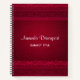 Un cuaderno de espiral personalizado con un fondo rojo decorado con elegantes remolinos y diseños ornamentales a lo largo de las fronteras.