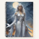 La elfa de cabello plateado se encuentra bajo la luz de la luna, vestida con ropajes que brillan como la noche estrellada. Su presencia es etérea y mágica.