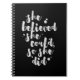 Cuaderno inspirador/diario que exhibe la frase "que ella creyó que ella podría, y así que ella" en la escritura blanca del cepillo con una textura orgánica de la tinta alcanzó un auténtico, mirada puesta letras mano.
