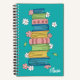 Cuaderno en espiral azul turquesa para niños con una pila de libros en acuarela y pequeñas flores. Personalízalo con el nombre del niño. Elige el tipo de papel que deseas en el interior.