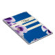 Hermoso diseño con flores moradas y fondo azul con líneas blancas más un lugar para tu nombre y texto personalizado.