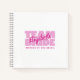 Diseño de cuaderno personalizado para tu grupo de damas de honor con "EQUIPO DE LA NOVIA" en negrita tipo rosa claro. Personaliza el nombre de la dama de honor en escritura rosa oscuro brillante coordinada. "MADRE DE LA NOVIA" o texto personalizado aparece debajo. La parte trasera del cuaderno es de rosa oscuro sólido. ¡Todos los colores en este diseño son personalizables en la herramienta de diseño de Zazzle! Envía un mensaje con preguntas o solicitudes de color personalizado.