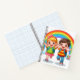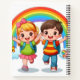 "Cuaderno colorido con un adorable niño y niña de dibujos animados corriendo bajo un arcoíris brillante con soles sonrientes, mariposas y nubes esponjosas – perfecto para niños y uso escolar."
