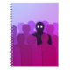Cuaderno espeluznante con un ilustracion conceptual geométrico de un fantasma y una sombra como una figura humana en una multitud de personas. La persona diferente es una figura negra oscura con ojos brillantes. Se distingue de la multitud, que consiste en formas moradas oscuras y humanoides. Aunque solo, la diferente está feliz de ser un raro.