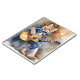 Arte de salpicar acuarela de un gato tabby naranja tocando guitarra.