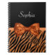 Su adolescente sentirá sumergido en lujo femenino con este naranja del diseñador y cuaderno elegantes del estampado de zebra del purpurina del negro con una cinta de la chispa de la lentejuela atada en un arco de lujo. Personalice este glitz y diseño atractivo de la moda del estampado de animales añadiendo su nombre. Imagen impresa del plano, purpurina o cinta no real.
