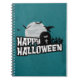 Feliz ilustracion de diseño de texto de Halloween con decoración de cementerios y murciélagos en luna llena sobre fondo azul grunge