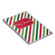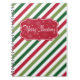 Feliz ilustracion navideño con texto y diseño de copos de nieve sobre fondo rayado rojo, blanco y verde