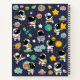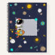 Iconos divertidos de astronautas y galaxias en un fondo estrellado de color azul marino oscuro.