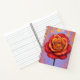 Elegant hardcover spiral deluxe notebook with fiery orange-red dreamy rose design blooming against a dreamy purple bokeh glow. Lightweight flexi-cover design, flat-lay vegan leather journal which includes 120 lined pages of premium 80gsm paper—ideal for journaling dreams or sketching petals.