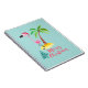 Un cuaderno con un lindo ilustracion de un flamingo rosado con un sombrero de santa roja. Junto a una palmera verde sobre un montón de arena amarilla. Se coloca un diseño de flamante árbol de navidad junto al texto Feliz Navidad. Escrito en el color rosa en un lujoso tipo de letra manuscrita. Fondo verde pastel.