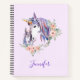 Portátil espiral con un elegante ilustracion acuarela con una madre acuarela y unicornio bebé con mané morado y forelock. Delicadas flores naranjas rodean al par.