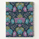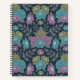 Este cuaderno cuenta con flores en tonos violeta, azul y verde oliva rodeadas de frentes de helecho morado mutado y hojas sobre un fondo azul oscuro.