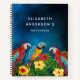 Un cuaderno con páginas en blanco para tus ideas de arte, bocetos, garabatos y dibujos para chicas adolescentes y mujeres. Un cielo azul oscuro como fondo. Tres loros en azul, rojo y amarillo sentados sobre hojas de palmera verdes. Flores amarillas, flores Hibiscus. Añade tu nombre y el título del libro. Texto blanco.