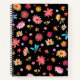Flores de colores vivos, de diferentes formas y tamaños, se dispersan por un fondo negro, creando un patrón vibrante y lúdico. El diseño combina el azul, el rosa, el naranja y el amarillo, lo que aporta un toque alegre y animado.