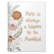 El bloc de notas presenta flores y hojas dibujadas a mano, agregando un toque de belleza natural con un mensaje escrito a mano que dice: "Siempre hay una razón para estar agradecido", que transmite un mensaje de gratitud y positividad.