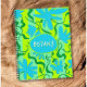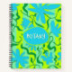 Spiral bound subject, or personal, notebook. Hand-drawn floral vines in bold colors of aqua blue, chartreuse and green. Include your name, or subject of study, in the center over a blue, uneven circle shape. Text is white with a shadow to stand out. The font is hand-written in casual printing. This large 8x11 size is perfect for class notes in botany or biology.