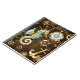 Fondo de madera marrón con mar, cresta mecánica, volante antiguo, ancla dorada y varios engranajes de oro y latón. Estilo Steampunk.