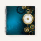 fondo turquesa, texturado, de vapor punk con bronce y oro, llave de plata y reloj. Estilo Steampunk.