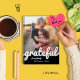 DIY un lindo cuaderno. Añade tus áreas de foto y texto personalizar favoritas para que sean especiales y únicas para ti o como regalo. El diseño presenta un guión moderno de bloques de color blanco y negro para la palabra agradecida.