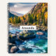 Portátil espiral con una fotografía pintoresca con montañas cubiertas de árboles en colores otoñales. Un río vibrante fluye alrededor de una multitud de rocas. Una gran luna blanca llena domina por encima.