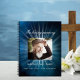 Un libro de invitados para un funeral o funeral. Un cielo azul como fondo. Rayos de luz blancos detrás de la foto. Personalice y agregue una foto, nombre y fechas. Letras blancas.