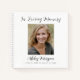 Personalice el bloc de notas funerario "In Loving Memory" con el nombre del guión negro, las fechas y la foto con fondo blanco. Texto adicional al revertir o borrar.