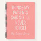 Keep every hilarious, touching, or unforgettable patient quote safe in this personalized nurse notebook that says “Things My Patients Said So I’ll Never Forget.” A perfect blend of humor and heart for nurses, doctors, medical assistants, and healthcare workers. Great for jotting notes during shifts or as a thoughtful gift for coworkers, nursing students, or graduates. Ideal for birthdays, nurse week, or hospital appreciation days. Customize with a name or title for a truly special touch!