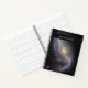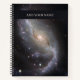 El cuaderno de espiral personalizado presenta la imagen de una galaxia espiral, nebulosa y estrellas. El texto o nombre personalizado se encuentra en la parte superior del mismo color que el centro de la galaxia sobre la banda ancha gris oscura.