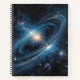 Una galaxia arremolinada de tonos negros y azules con una brillante estrella central que resplandece en el espacio.