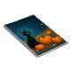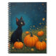 En un campo iluminado por la luna, un gatito negro juguetón teje a través de calabazas vibrantes, su naranja se abraza suavemente. Encima, un cielo oscuro brilla con brillantes estrellas, creando una mágica escena nocturna.