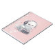 Gatito con radio y auriculares en fondo rosa con bloc de notas de estrellas