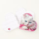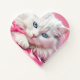 Hermoso gato blanco con ojos azules y cintas rosadas enredadas en rosa.