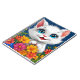 Gato de dibujos animados adorable con pelaje blanco esponjoso y grandes ojos azules expresivos. El gato está asomando juguetonamente desde un vibrante ramo de flores coloridas, que incluyen flores naranjas, rosadas, amarillas y azules. Su pequeña nariz rosa y su sonrisa alegre añaden encanto, creando una atmósfera juguetona e invitante. El fondo es de un azul profundo, que realza el brillo de las flores y los rasgos del gato, haciendo que toda la escena se sienta animada y alegre.