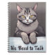 Cuaderno en un ilustracion de un gato grisáceo de aspecto severo con ojos penetrantes amarillos posando sus patas delanteras sobre una cornisa, mirando directamente hacia delante con un aire de autoridad seria. Debajo del gato, el guión en negrita dice "Necesitamos hablar", agregando humor y drama.