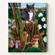 Gato de tom gris encaramado en una casa de hadas hecha de un tocón de árbol. Hadas tocando una flauta y un ratón afuera tejiendo en su silla rodean al gato.
