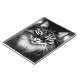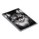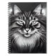 Cuaderno en un retrato de cierre de un gato forestal noruego con un sombreado detallado en escala de grises, mostrando sus intrincados patrones de piel. El uso de negros y blancos contrasta marcadamente para resaltar el rostro del felino.