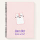 Un cuaderno en espiral con el ilustracion de un lindo gatito dormido. Los ojos cerrados parecen felices y pacíficos. Se coloca sobre un fondo rosa pálido. Personalizar con nombre. La parte posterior tiene la misma imagen en formato de patrón.