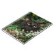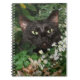 El gato negro mira desde la margarita como flores silvestres en las que se ha metido con un cuaderno de fotos